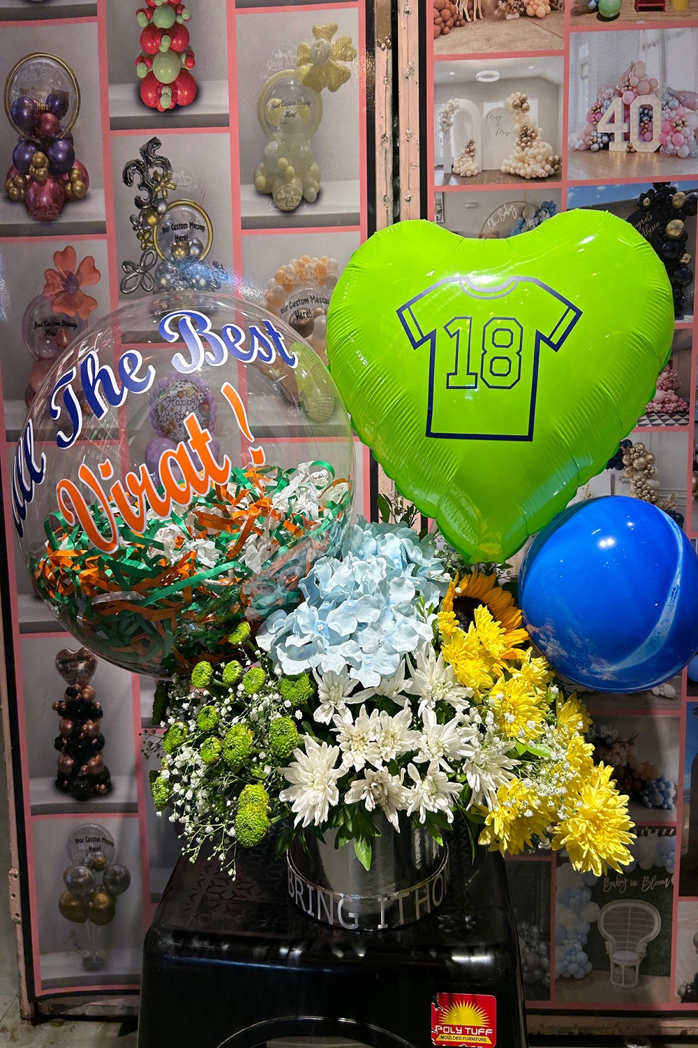 A cheerful bouquet combining lime green accents, white blooms, and touches of blue. Enhanced with colorful balloons and a personalized message, this arrangement radiates positivity and celebration.
